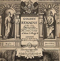 John Hales was a principled English protestant divine born at Bath in 1584. After an education at Oxford, he was elected fellow of Eton College, the capacity for which he is best known. By 1636, his liberal theological views had brought him into conflict with the masterful,autocratic William Laud, Archbishop of Canterbury, who however, was so charmed by his learning and conversation, that he appointed him as a canon of Windsor.