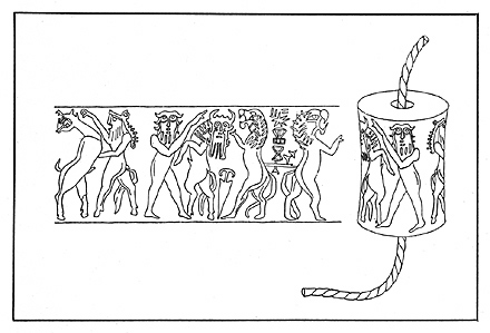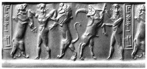Most archaeologists and commentators believe the artefacts in the Sutton Hoo boat grave to be Anglo Saxon. H W Chadwick believed the king buried there was Raedwald, c.620AD. We should not rule out the possibility that the accompanying grave goods are stolen goods, originally native British. The motif displayed above from Sutton Hoo has been compared with earlier Gilgamesh seal motifs from Mesopotamia: