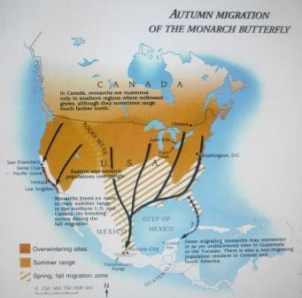 It has been known for a long time that monarchs west of the Rocky Mountains migrate south and winter in California. They can be seen hanging in clusters in pine and eucalyptus trees in places along the southern coast of California. But the destination of the migration of large populations of monarchs in eastern Canada remained a mystery for some time.